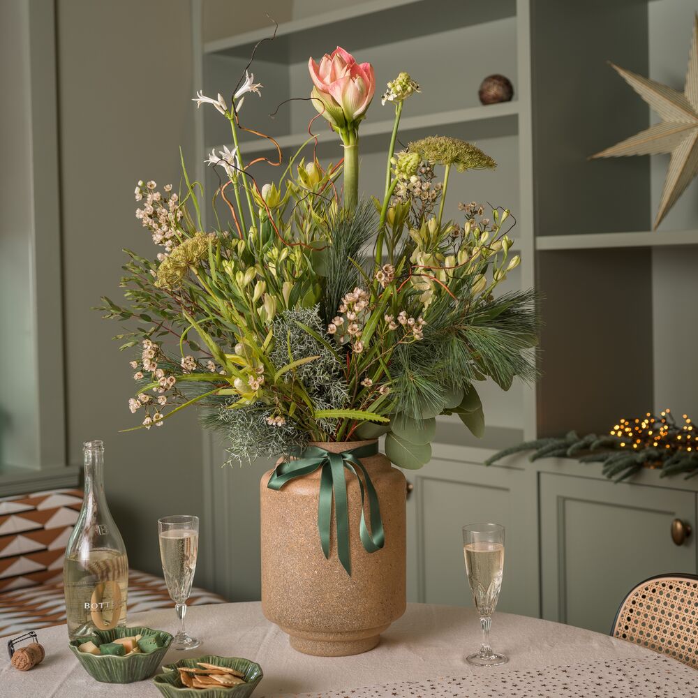 Puur, natuurlijk en verfijnd! Het Decemberpracht boeket ademt rust met z'n subtiele groentinten en natuurlijke uitstraling. Een sierlijke amaryllis in zacht roze vormt het hart, omringd door witte orchideeën, fris groen en speelse kronkeltakjes die alle kanten op dansen. Het lange dennengroen en de rijke variatie aan groene texturen geven het boeket een organische, bijna wilde uitstraling. Door de sobere kleurenkeuze en artistieke schikking is dit boeket perfect voor wie houdt van rustige elegantie tijdens de feestdagen. Ideaal voor een stijlvol interieur waar minder écht meer is. Bij wie mag deze natuurlijke winterpracht verschijnen?