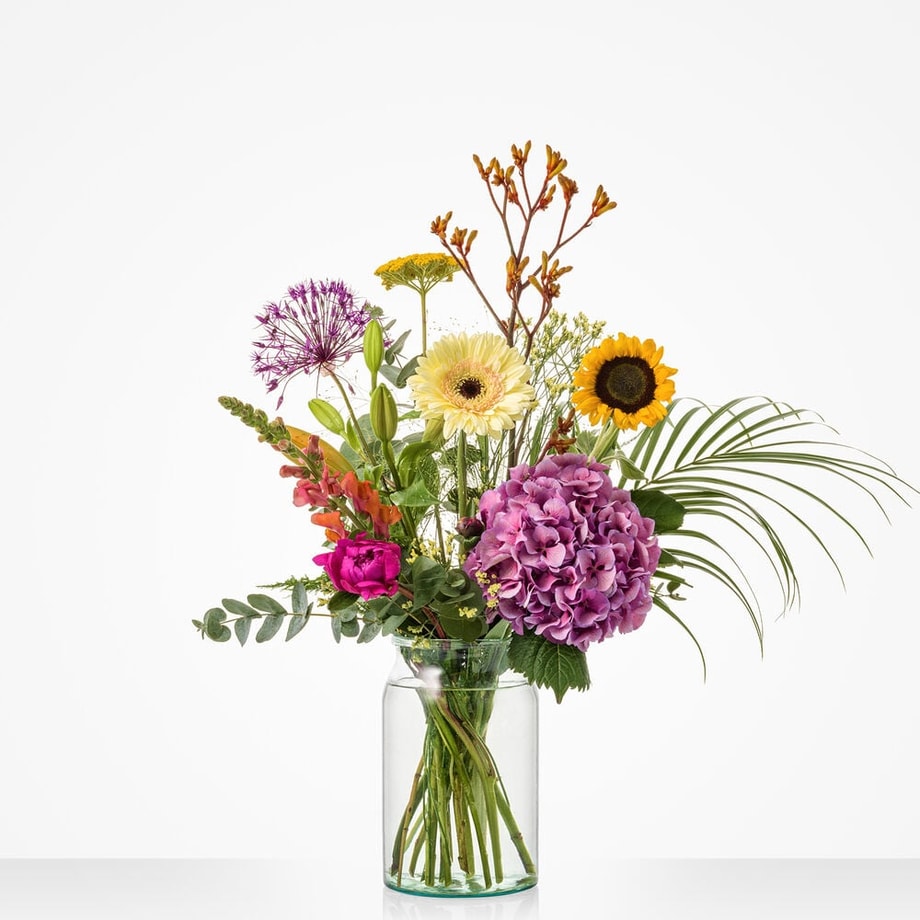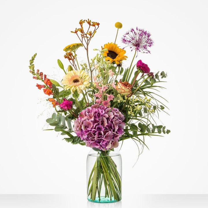 Met een zwoele zucht blaast juni ons zo de zomer in. Het Maandboeket juni symboliseert deze natuurlijke overgang naar het zomerseizoen. Het bloemstuk is speels en levendig geschikt met prachtige zomerbloemen als de hortensia en zonnebloem, aangevuld met roze roos en gerbera. Het geheel oogt hierdoor ontzettend natuurlijk en wild, waardoor het je echt een zomergevoel geeft. Wie gun jij dit bijzondere gevoel?