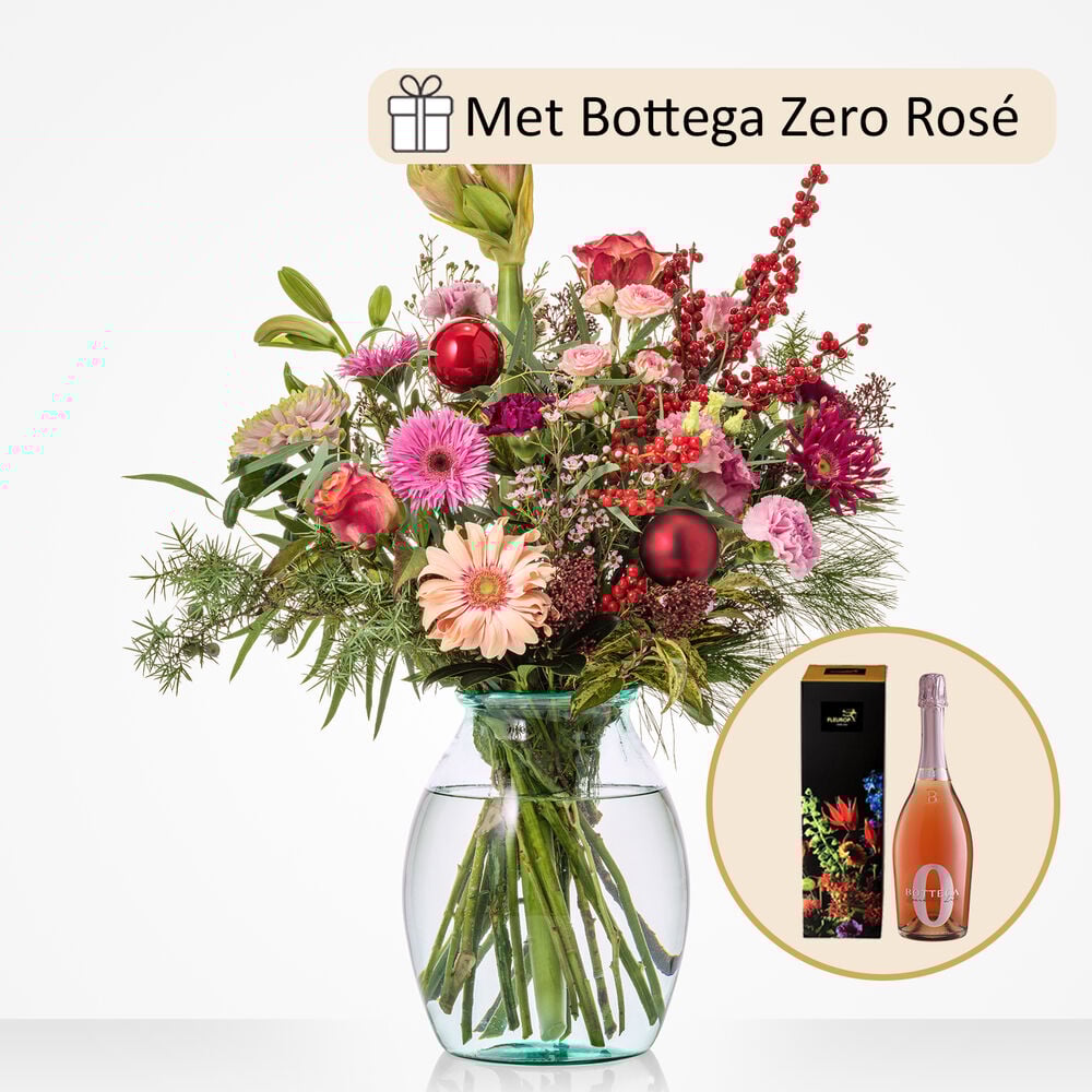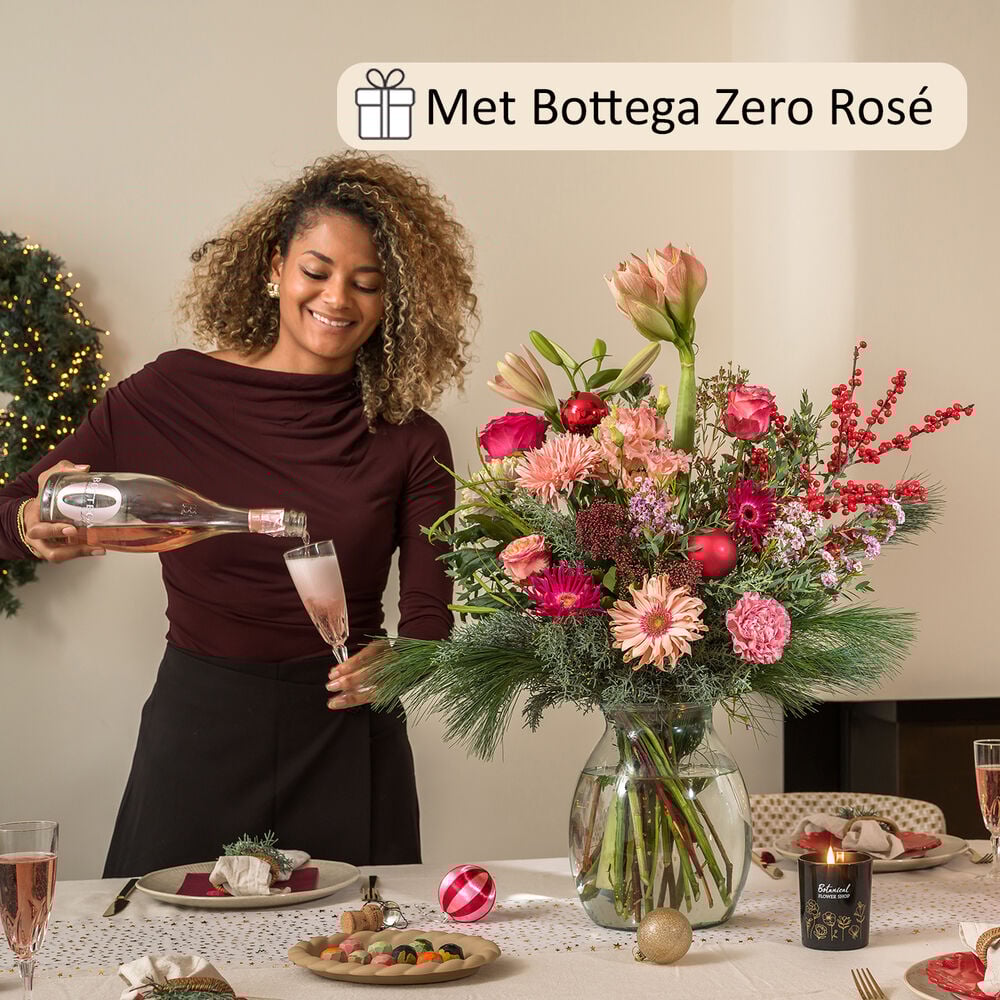 Maak december extra feestelijk met deze stijlvolle cadeauset, bestaande uit een feestelijk boeket en Bottega Sparkling Zero Rosé. Het kerstboeket is met aandacht en liefde samengesteld door de lokale Fleurop bloemist en behoort niet voor niets tot onze fa