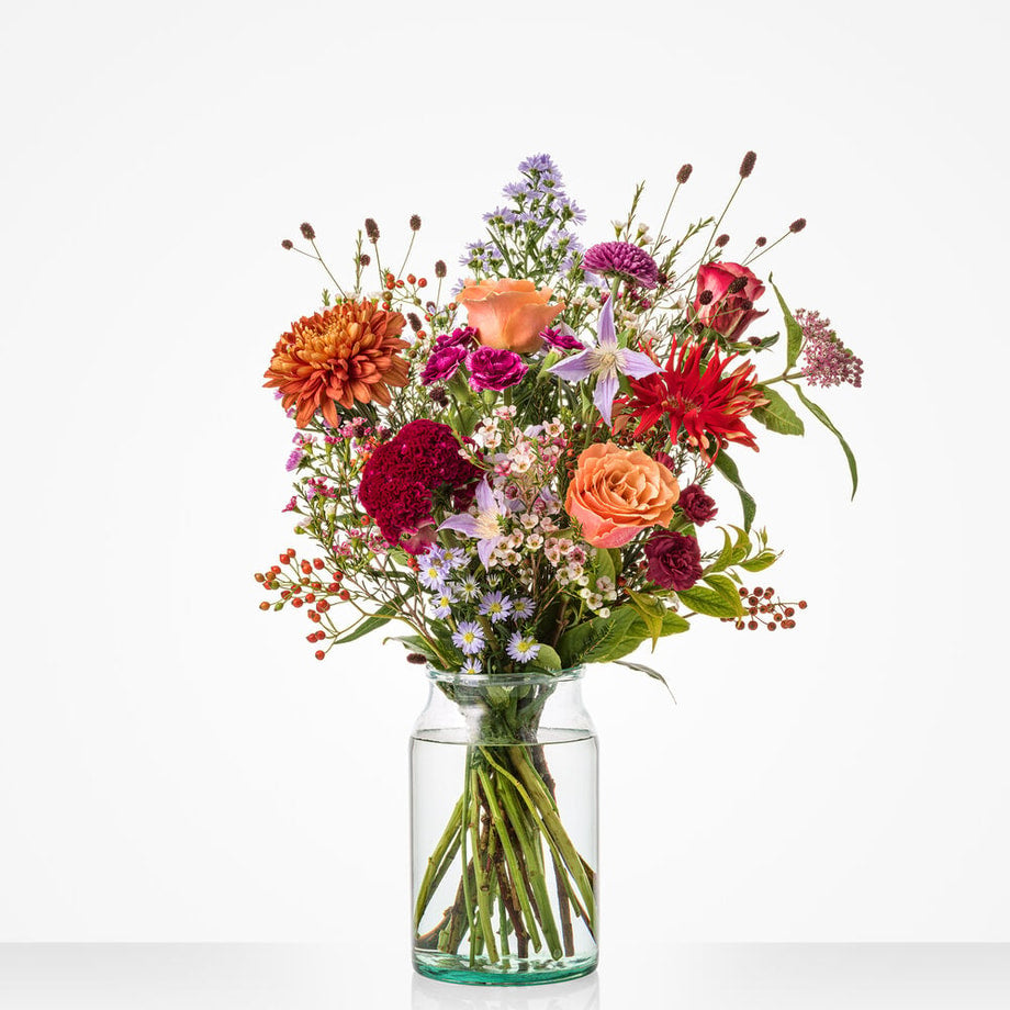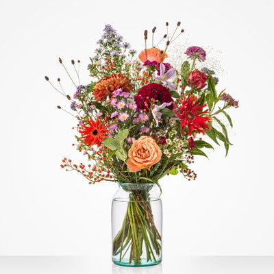 De mooiste herfstbloemen en de warmste najaarstinten worden hier op een sublieme manier samengebracht tot misschien wel hét ultieme herfstboeket van het moment. Tinten als moederzacht lila, avondgloed oranje en kastanjerood laten je heerlijk wegdromen als buiten de regen tegen de ramen tikt. En de statige vormen van de roos en de aster in combinatie met de vrolijke chrysant zorgen ervoor dat je je ogen bijna niet van het boeket kan afhouden. Wie gun jij dit Maandboeket oktober?