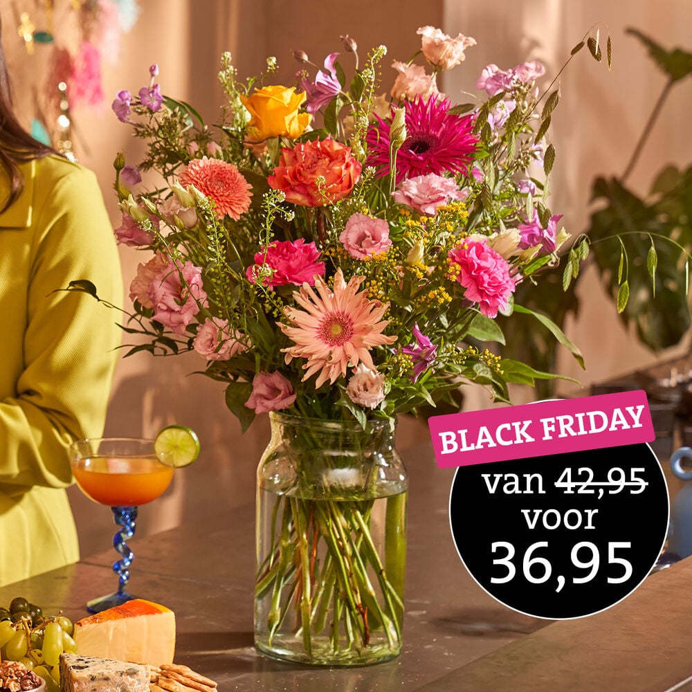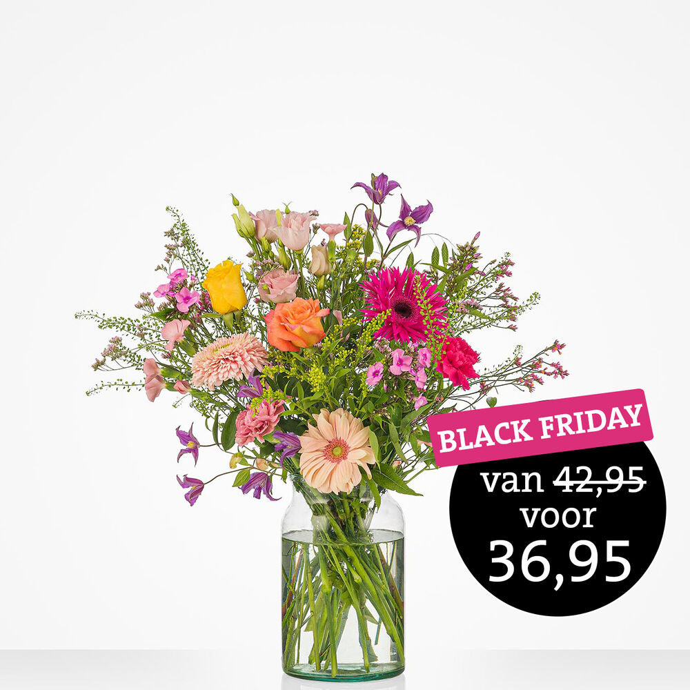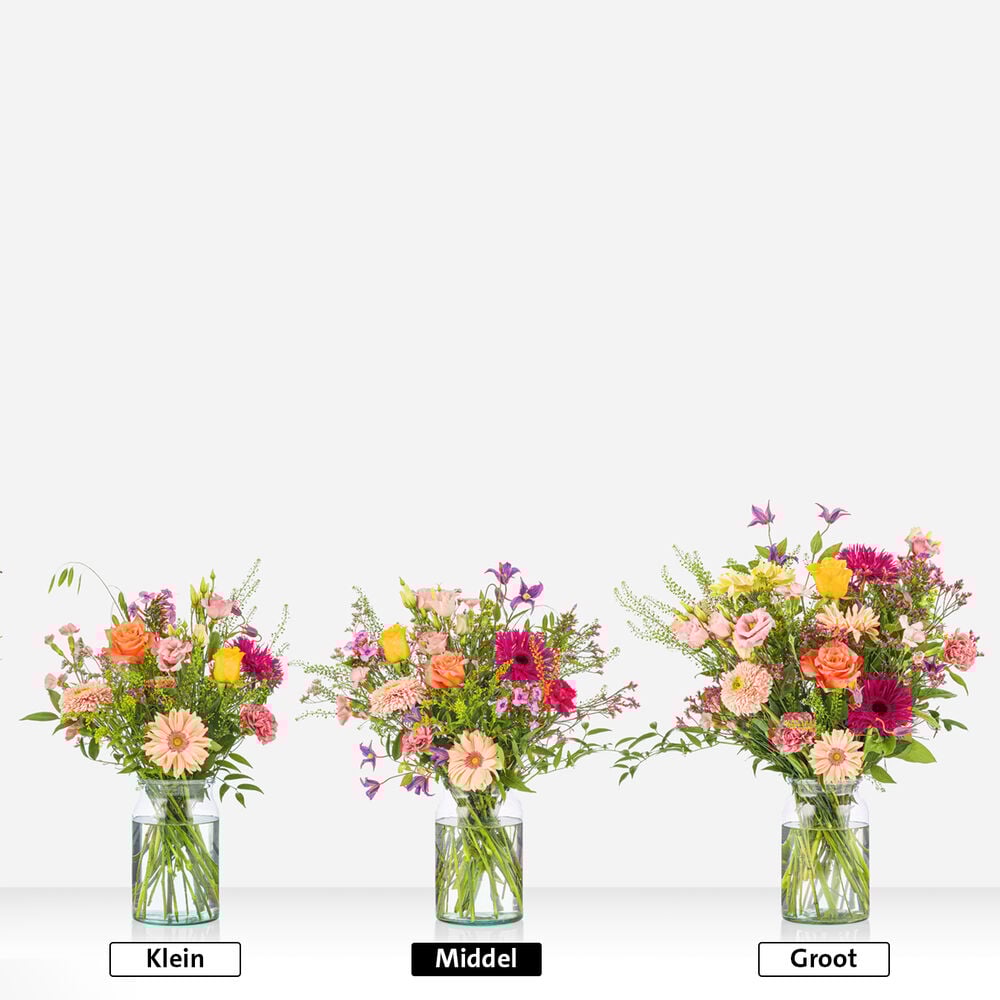 Breng direct een glimlach in huis met boeket Vrolijk plukgeluk. Dit speelse plukboeket zit vol kleurrijke bloemen die op een natuurlijke, losse manier zijn geschikt. De verschillende tinten zorgen voor een levendige uitstraling die iedere ruimte opfleurt.